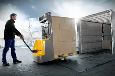 אדם הולך עם תורן (מלגזון)- Jungheinrich EJC-212-220 בעלת כושר הרמה של עד 2000 ק"ג.